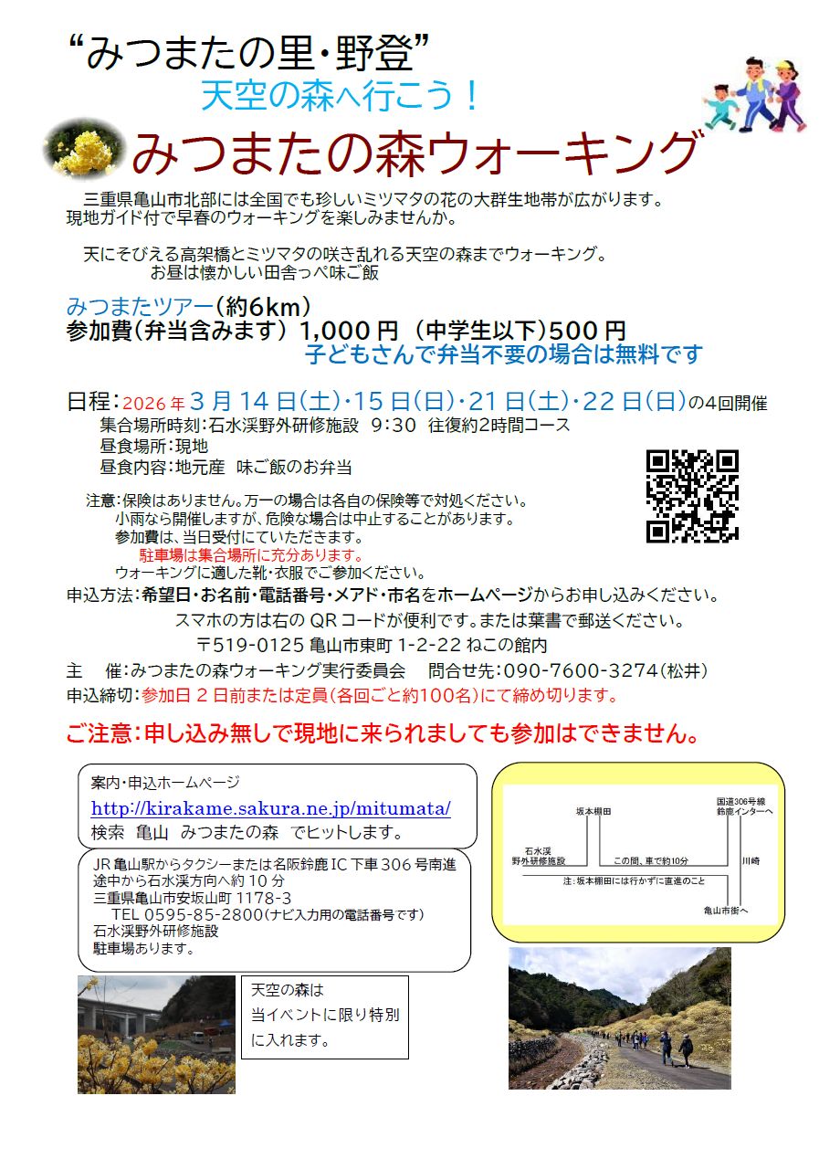| 2026年 ウォーキング “みつまたの里・野登” 天空の森へ行こう! 2026年3月14日(土)・15日(日)・21日(土)・22日(日)の4回開催します みつまたツアー(約6km) 参加費(弁当含みます) 1,000円 (中学生以下500円) 子どもさんで弁当不要の場合は無料です 日程:2026年3月14日(土)・15日(日)・21日(土)・22日(日)の4回開催 集合場所時刻:石水渓野外研修施設 9:30 往復約2時間コース 昼食場所:現地 昼食内容:地元産 味ご飯のお弁当 注意:保険はありません。万一の場合は各自の保険等で対処ください。 小雨なら開催しますが、危険な場合は中止することがあります。 参加費は、当日受付にていただきます。 駐車場は集合場所に充分あります。 ウォーキングに適した靴・衣服でご参加ください。 申込方法:希望日・住所・お名前・電話番号をフォームから申し込みください。 電話でのお申し込みはご遠慮ください。 下のQRコードからも入れます。 |